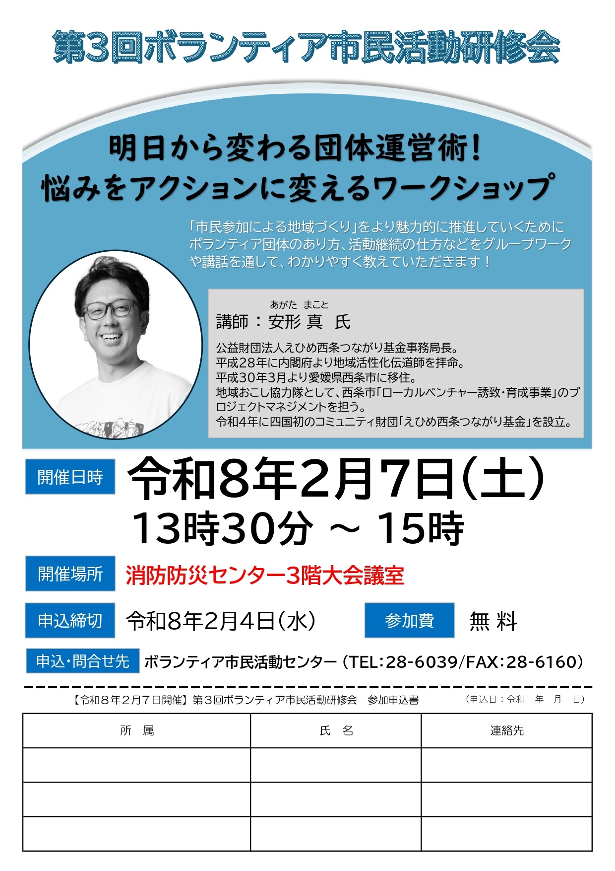 第3回ボランティア市民活動研修会 開催場所変更のお知らせ 2026年01月20日 | ボラセンからのお知らせ 市役所市民交流棟にて開催予定でしたボランティア市民活動研修会の開催場所が消防防災センター3階大会議室に変更になりました。 Tweet